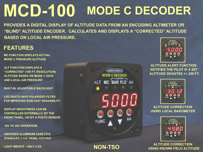 The MCD-100 is a light-weight, solid-state instrument that provides a digital display of the altitude information generated by an encoding altimeter or electronic "blind" altitude encoder to a transponder. The MCD-100 monitors the altitude data lines between the encoder and transponder, decodes the altitude with a microprocessor, and displays it on a large bright LED display. This allows the pilot to see the altitude that is transmitted to ATC at all times. The MCD-100's microprocessor also can calculate and display a "corrected" altitude based on the local barometer setting. This is similar to the calculation done by the ATC facility. The barometer setting can be adjusted to a known local barometer value or calculated by entering a known altitude such as the field altitude during run-up.
