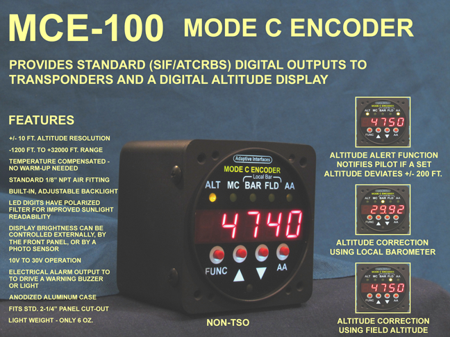 The MCE-100 is a light-weight, solid-state instrument that provides accurate easy-to-read altitudes up to 32,000 feet. The MCE-100 displays altitude with a 10 ft. resolution on a large bright LED display. In addition to being a digital altimeter, the MCE-100 is a Mode C altitude encoder designed to drive a large variety of aircraft transponders. Unlike older electronic altitude encoders that require several minutes of warm up time before they can transmit their code, the MCE-100 is ready instantly due to its internal temperature compensation.