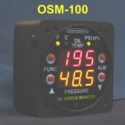 The OSM-100 provides accurate, simultaneous readings oil temperature and pressure. The OSM-100 can be used with a wide variety of sensors for both temperature and pressure. Alarm levels can be set for both high and low temperatures and high and low pressures to warn the pilot of and dangerous engine conditions. The OSM-100 can display readings in both English and Metric units.