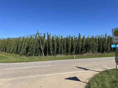 After Eining, the trail left the river and passed through a very hilly area of farmland. After pulling some big hills among the corn fields, I came across several fields the were growing hops. Poles, about 4 meters high, were strung with ropes with dangling ropes for the hops vines. Finally, the trail headed downhill to the towns of Staubing and Weltenburg.